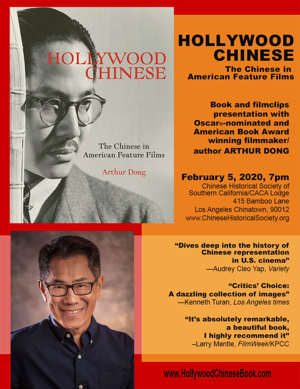 Arthur Dong, CHSSC monthly meeting guest speaker, presents a guided visual tour of his critically acclaimed book Hollywood Chinese. Doors open at 6:30 for check-in and refreshments; free and open to the public. Books will be available for purchase and signing.